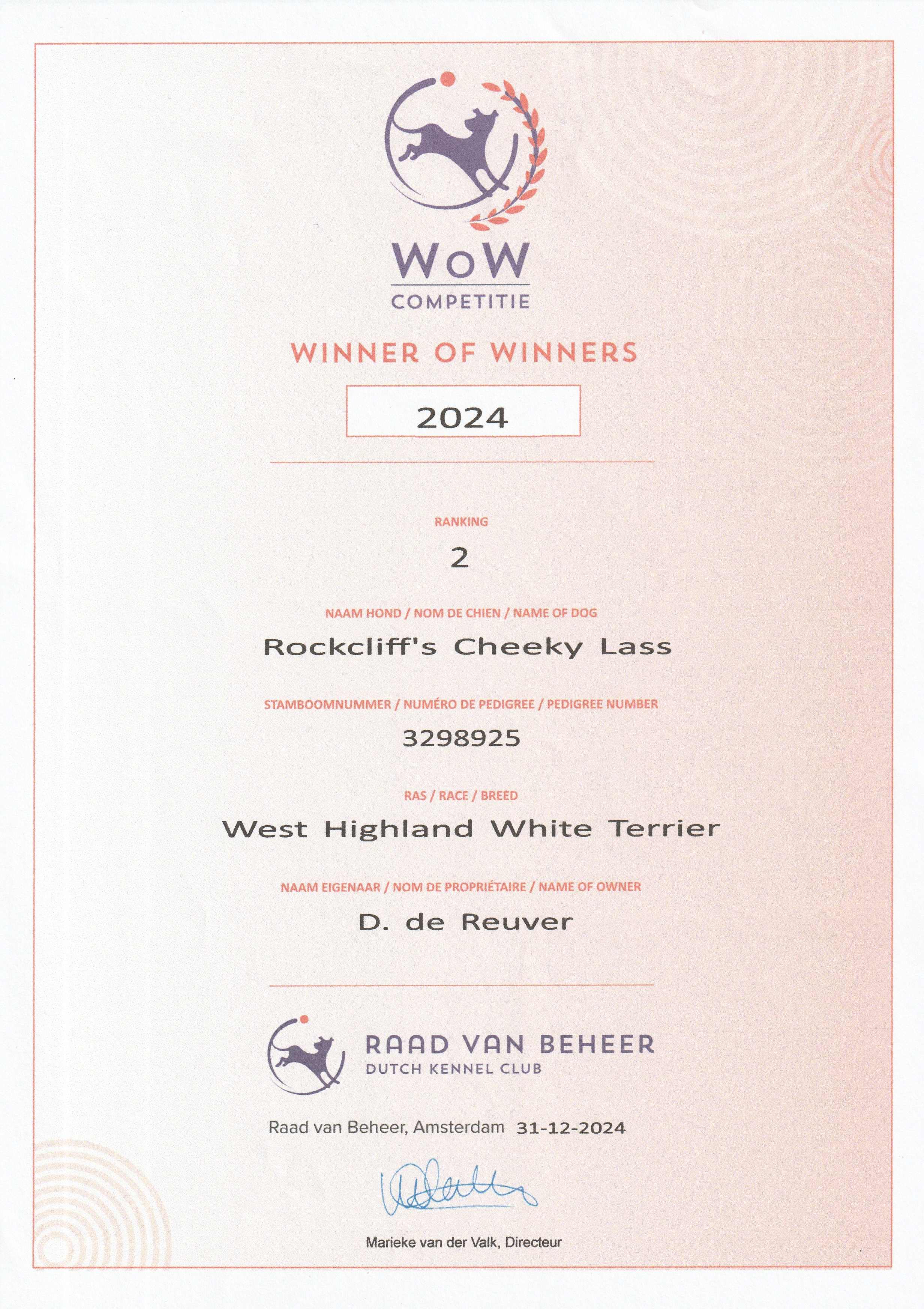 Met de Winner of Winners kennelcompetitie behaalde mijn kennel ROCKCLIFF'S de 2e plaats. Een mooi resultaat omdat ik alleen Kate 6 maal onder mij kennelnaam heb geshowd.